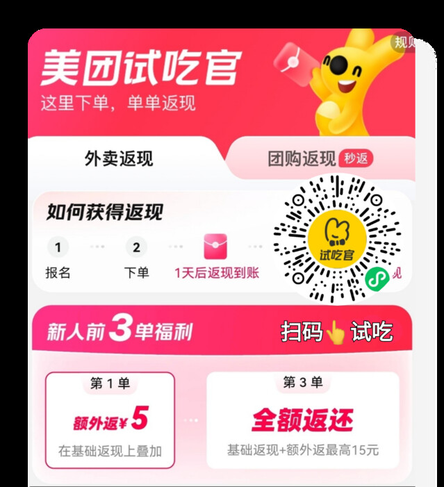 【同店同餐不同价】美团 or 美团试吃官外卖下单即返现+叠加红